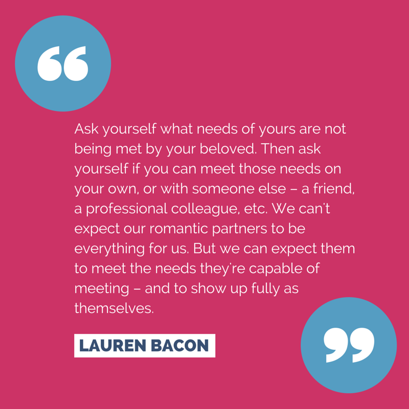 Ask yourself what needs of yours are not being met by your beloved. Then ask yourself if you can meet those needs on your own, or with someone else – a friend, a professional colleague, etc. We can’t expect our romantic partners to be everything for us. But we can expect them to meet the needs they’re capable of meeting – and to show up fully as themselves.